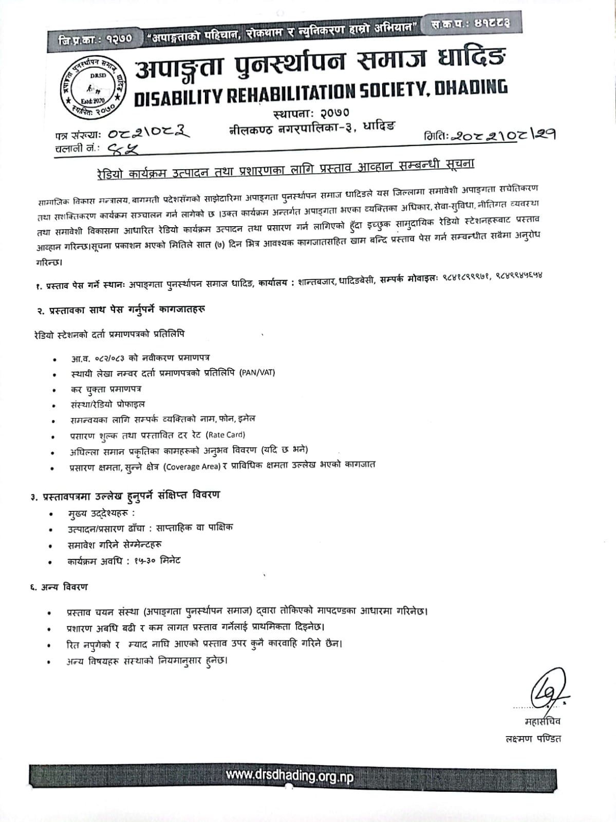 रेडियो कार्यक्रम उत्पादन तथा प्रशारणका लागि प्रस्ताव आव्हान सम्बन्धी सूचना